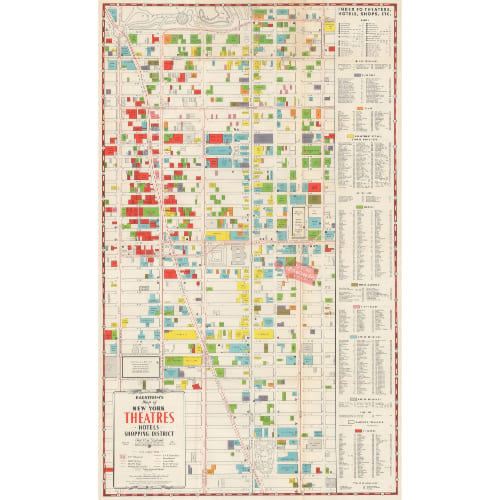This vibrant, color-coded guide highlights the architectural heart of the city, detailing iconic landmarks like Rockefeller Center and the Theater District with artistic precision.